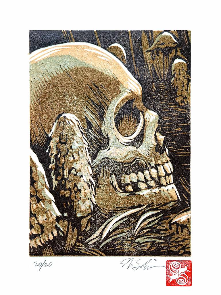 Known as reduction prints, his images are carved into a linoleum block a little at a time, with successive layers of ink in different colors printed onto paper.