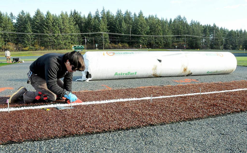 Joey Butcher of Seattle-based Coast to Coast Turf installs a foul line at the baseball diamond at Volunteer Field in Port Angeles on Thursday as part of an upgrade to the sports facility. The infield area of the diamond is being replaced with an artificial surface, cutting down on continual maintenance to the diamond.