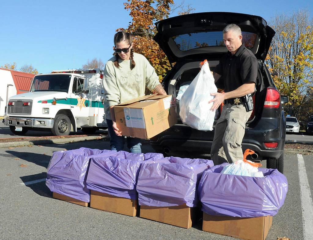 Helen Kenoyer of the Olympic Peninsula Community Clinic and Inspector Josh Ley of the Clallam County Sheriffs Office unload unwanted pharmaceuticals and medications from the agency at a drop-off point at the Clallam County Courthouse during Saturday’s National Prescription Drug Take Back Day.
