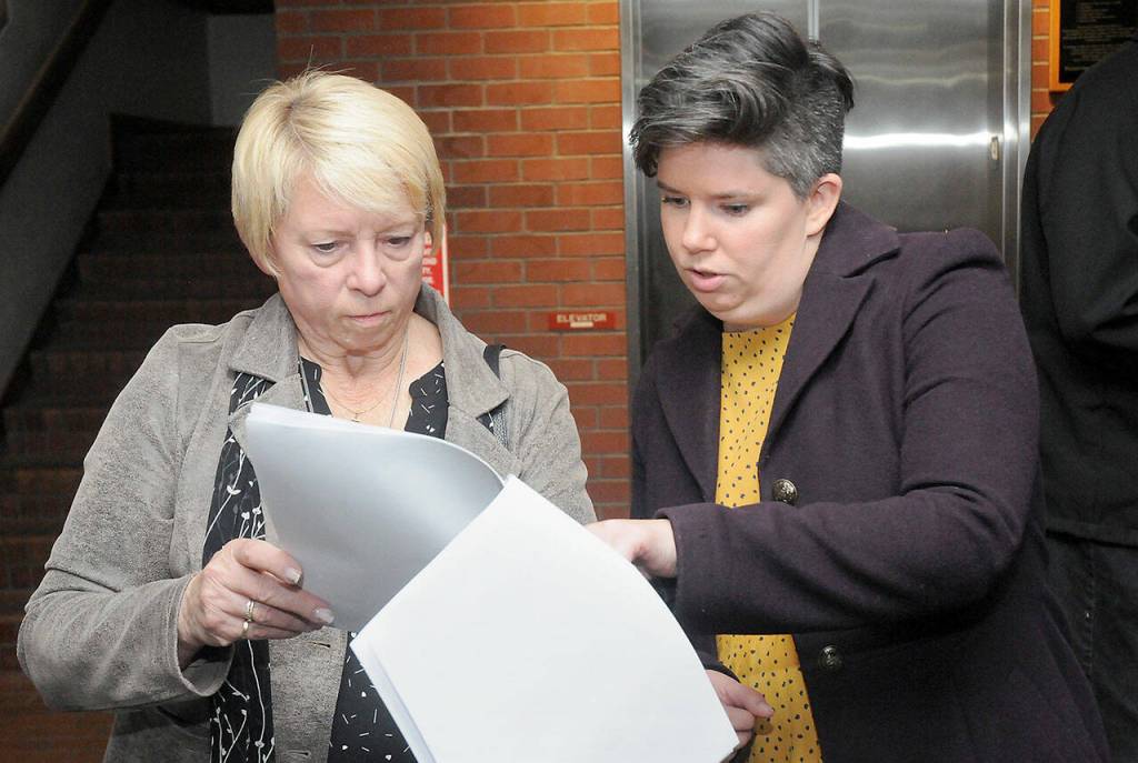 Port of Port Angeles incumbent Connie Beauvais, left, and incumbent Port Angeles City Council member Navarra Carr examine early election returns on Tuesday at the Clallam County Courthouse. (Keith Thorpe/Peninsula Daily News)