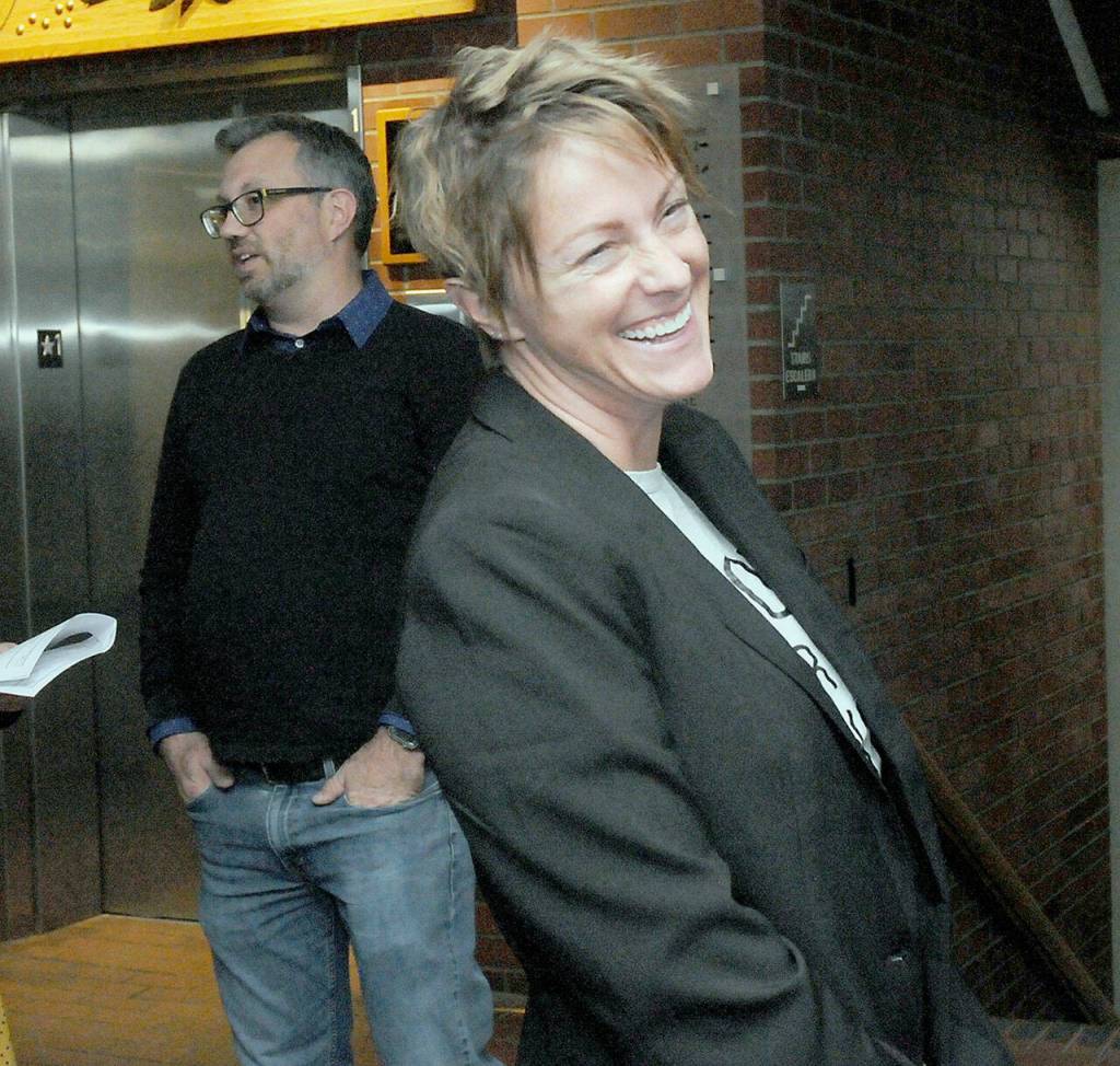 Appointed Port Angeles City Council member Amy Miller reacts to her early lead for an elected seat on Tuesday night at the Clallam County Courthouse. Behind is Clallam County Commissioner Mike French. (Keith Thorpe/Peninsula Daily News)