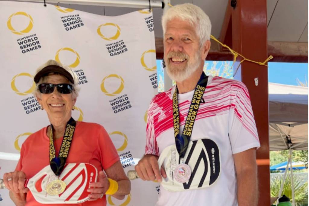 Beverly Hoffman and Steve Bennett from the Olympic Peninsula each won multiple medals at the Worl.d Senior Games last week in St. George, Utah, in the 75-70 age group for pickleball. (Courtesy photo)