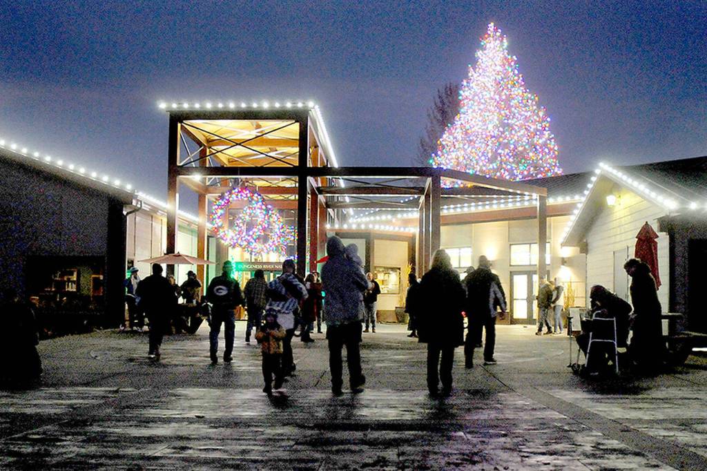 The Dungeness River Nature Center stands illuminated by Christmas lights as visitors roam the outdoor patio after a lighting ceremony for the center and nearby Railroad Bridge on Thursday night in Sequim. Hundreds of people took part in the event, which featured holiday songs by the Sequim High School Choir on the historic bridge over the Dungeness River.