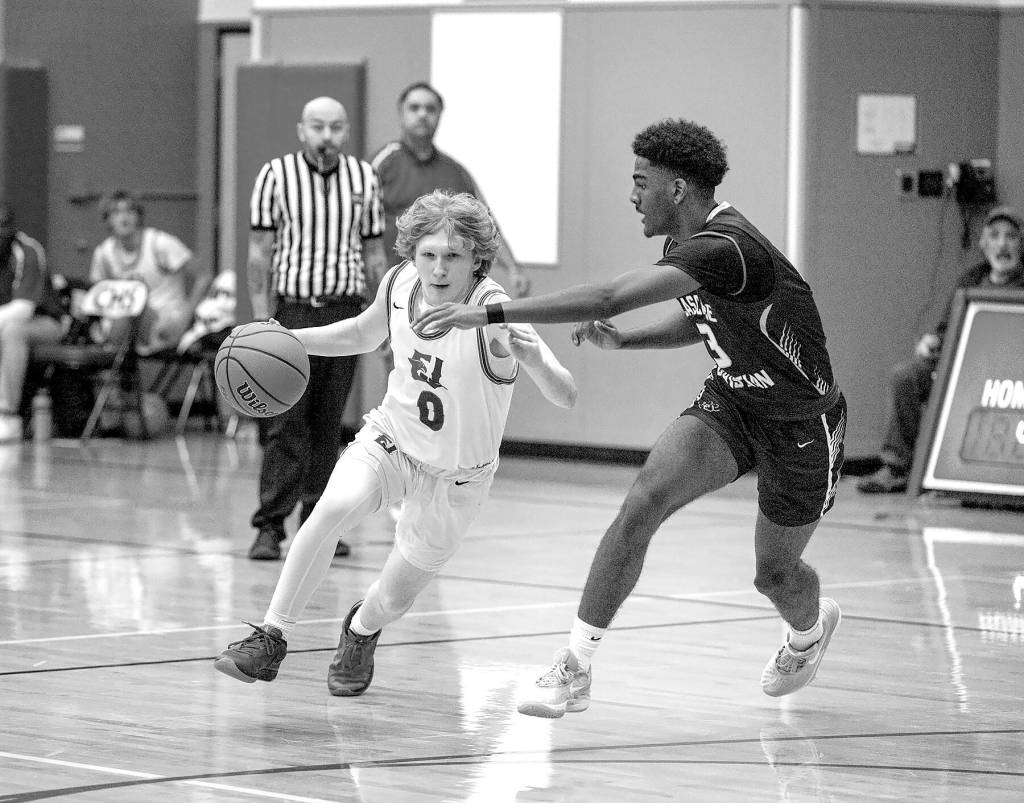East Jefferson’s Tracycen Brown, left, gets around the defense of Cascade Christian’s Josiah Gopaul during a Thursday night home game played in Chimacum. The Rivals fell 63-39 to the Cougars.