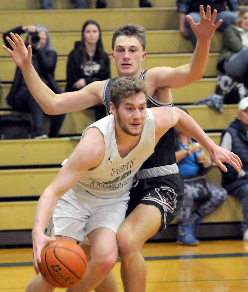Port Angeles’ Blake Sohkberg, right, advances downcourt defended by W.F. West’s Lucas Hoff on Tuesday at Port Angeles High School.