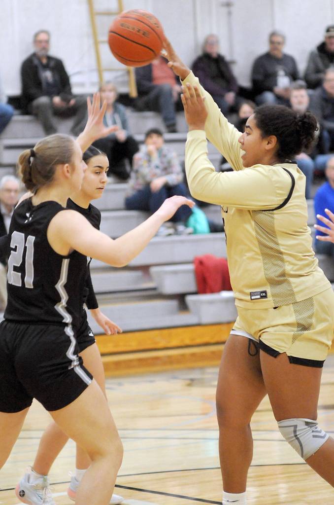 KEITH THORPE/PENINSULA DAILY NEWS Peninsula’s Shania Moananu, center, squeezes between Whatcom’s Ella Huyntington, left, and Alexa Rodriguez on Wednesday night at Peninsula College.