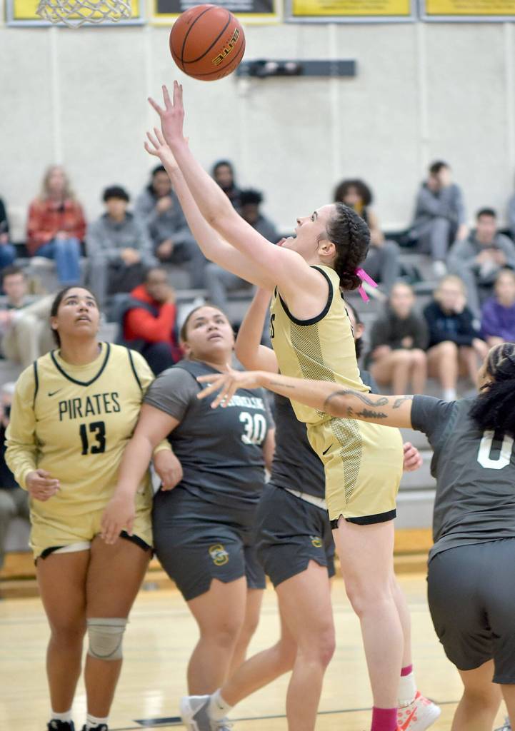 Peninsula was down 15-7 early but erupted on a 13-2 run, thanks to a Shania Moananu three-point play and a 3-point shot and two-point bucket from Neah Bay’s Allie Greene. The Pirates then stretched it out to a 41-18 run to take a commanding 48-33 lead en route to a 77-64 victory over a fired-up Dolphins squad to remain unbeaten and all alone in first place in the North.