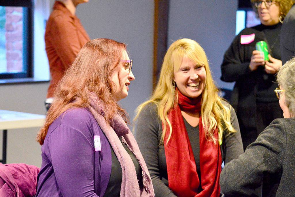 Port Townsend Library Director Melody Sky Weaver, left, and restaurateur Kris Nelson talked with community members at the Creative District plan unveiling Tuesday in Port Townsend. Diane Urbani de la Paz/For Peninsula Daily News