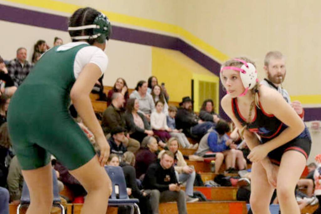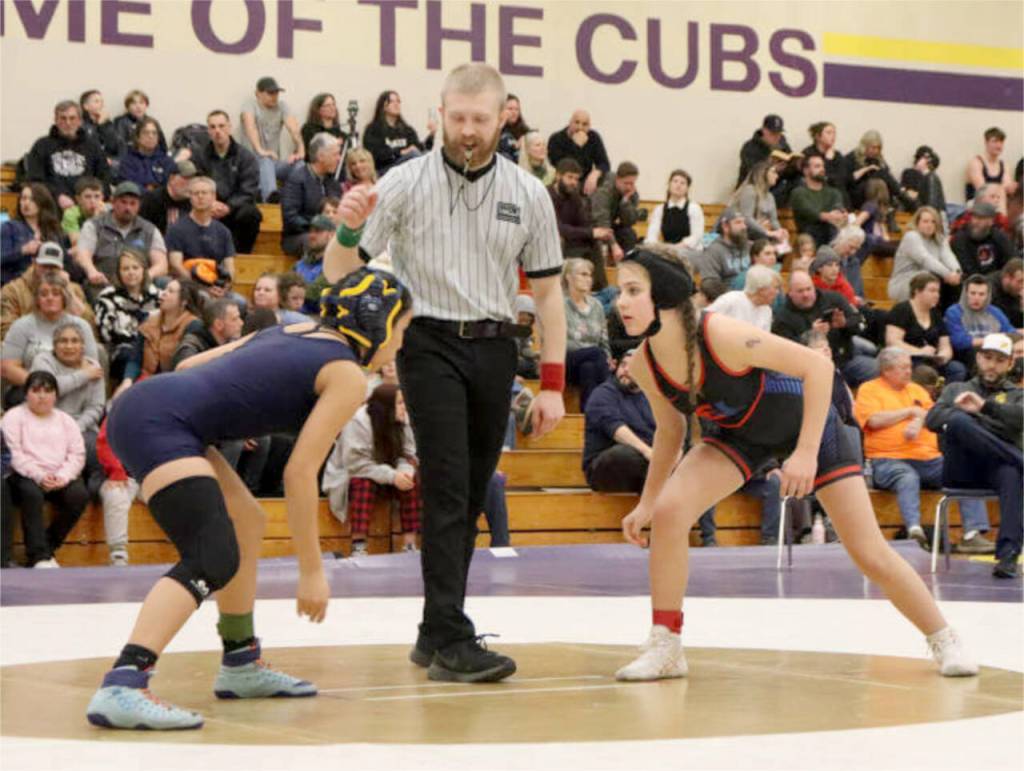 Below, Layla Grimm, a Blue Heron Middle School sixth-grader, competed in her first wrestling event last week in Port Townsend, facing off against Forks seventh-grader Kim Camacho. Grimm got a pin in the third period on her way to two victories.