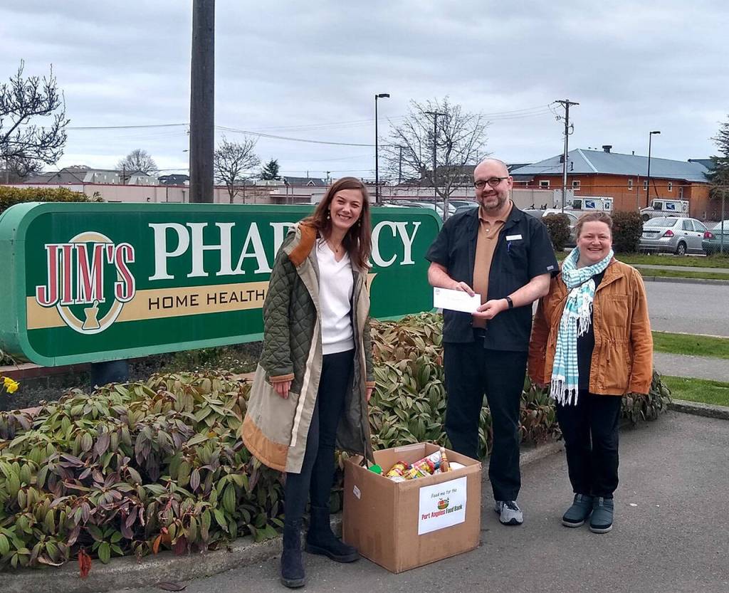 The Port Angeles Food Bank was the recipient of Jim’s Cares Monthly Charity at Jim’s Pharmacy in Port Angeles. The food bank collects and distributes food to local families in need. Staff and customers at the pharmacy raised more than $509 to support the program. Pictured, left to right, are Hermina Solomon, Ryan French and Amy McIntyre.