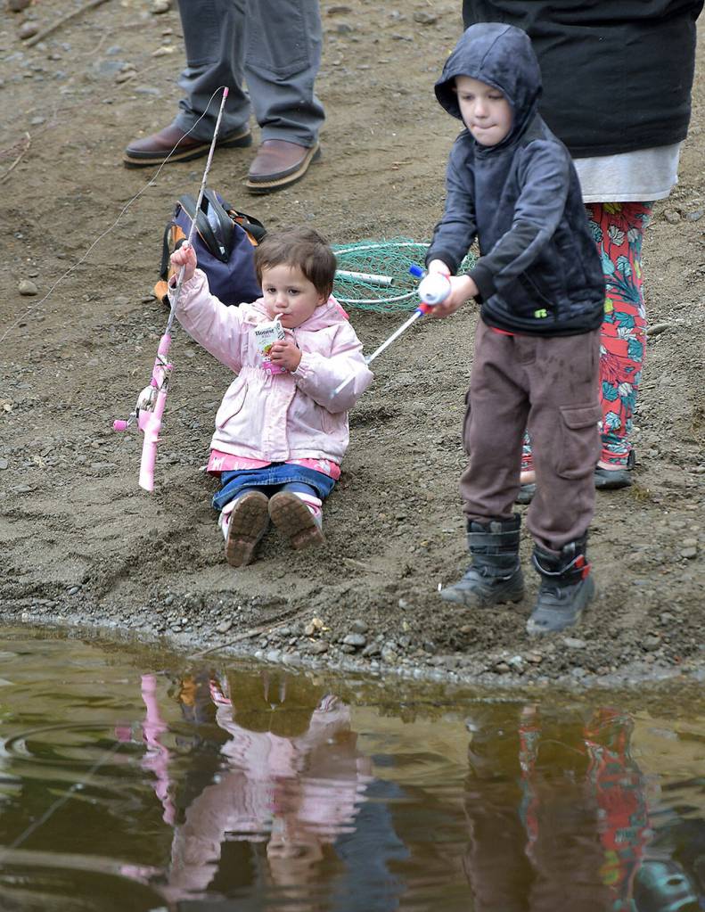 (Below) Rosalee Stark, 3, and her brother, Hunter Olson, 7, both of Port Angeles, try their hands with rods and reels during Saturday’s Kids’ Fishing Derby at the Lincoln Park ponds. The event, sponsored by the Olympic Peninsula Fly Fishers, drew hundreds of young anglers and their parents to the park for prizes and the joy of pulling in fish. (Keith Thorpe/Peninsula Daily News)