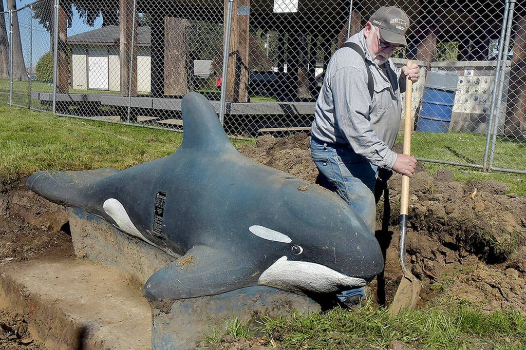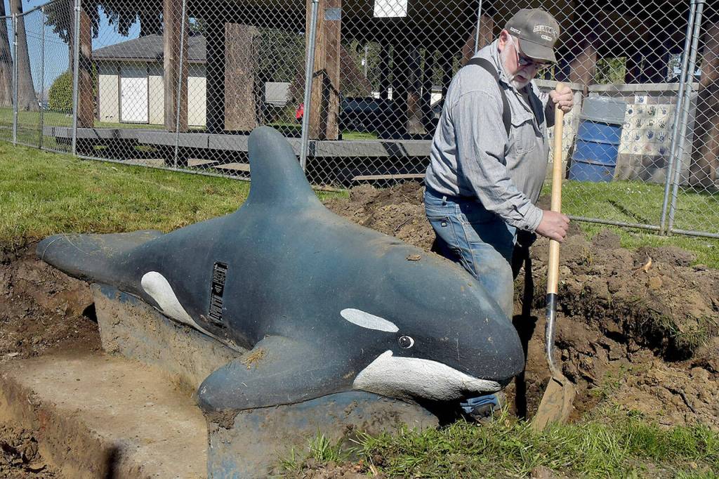 Bob Edgington of 2 Grade LLC excavating, which donated its resources, pulls dirt from around the base of an orca sculpture at the Dream Playground at Erickson Playfield on Thursday during site preparation to rebuild the Port Angeles play facility, which was partially destroyed by an arson fire on Dec. 20. A community build for the replacement playground is scheduled for May 15-19 with numerous volunteer slots available. Signups are available at https://www.signupgenius.com/go/904084DA4AC23A5F85-47934048-dream#/.