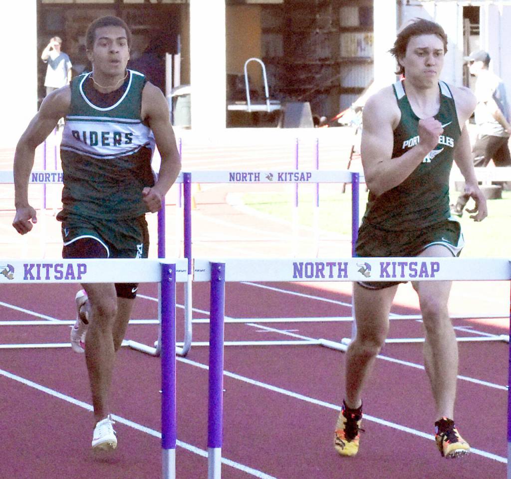 Nicholas Zellar-Singh/Kitsap News Group Port Angeles’ Donovan Heins, left, and Parker Nickerson prepare to leap during the 110-meter hurdles Thursday at the Olympic League Track and Field Championship at North Kitsap High School