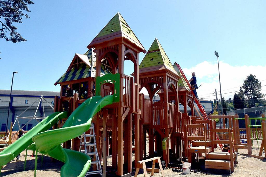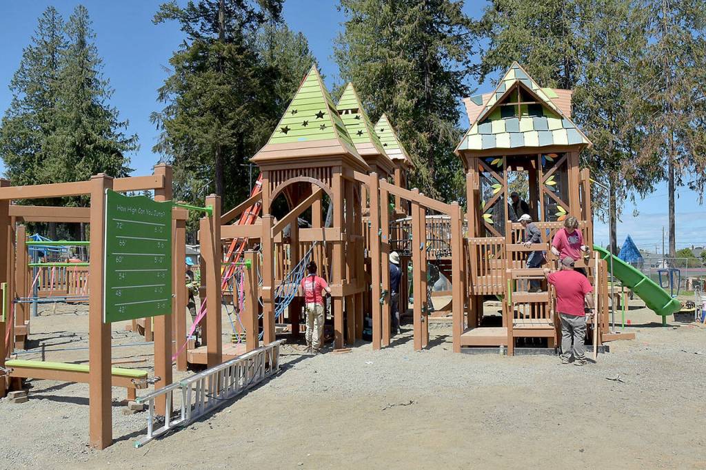 Volunteers work to construct the main play structure of the Dream Playground at Erickson Playfield in Port Angeles on Sunday, the last day of a five-day community build to replace play equipment destroyed by arson in December.