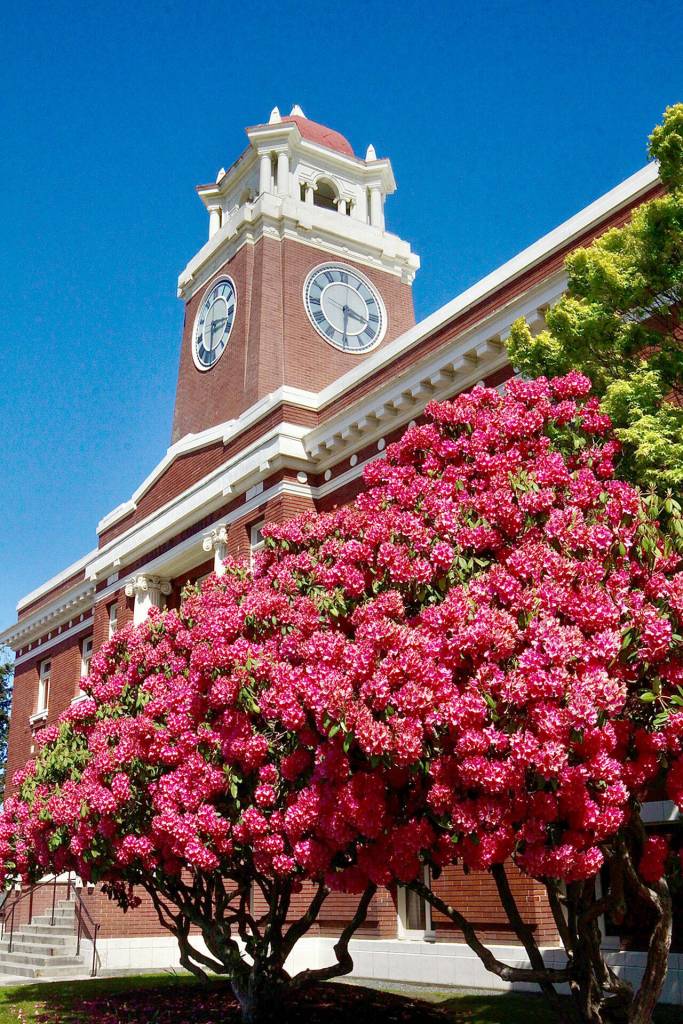 The rhododendrons in front of the Clallam County Courthouse are in full bloom on Monday. Spring weather will turn to showers for the rest of this week with high temperatures in the high 50s to low 60s.