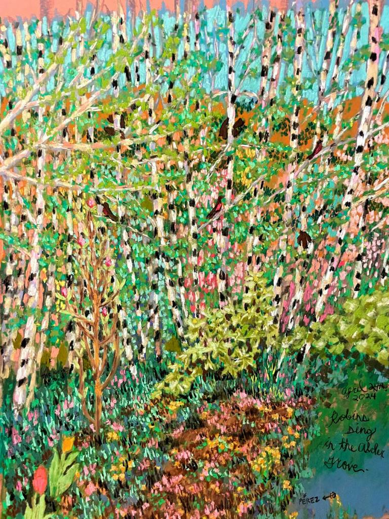 Isabel Elena Pérez’s pastel “Robins in the Alder Grove” is part of the “Lush Language” exhibit at Northwind Art’s Jeanette Best Gallery in Port Townsend.