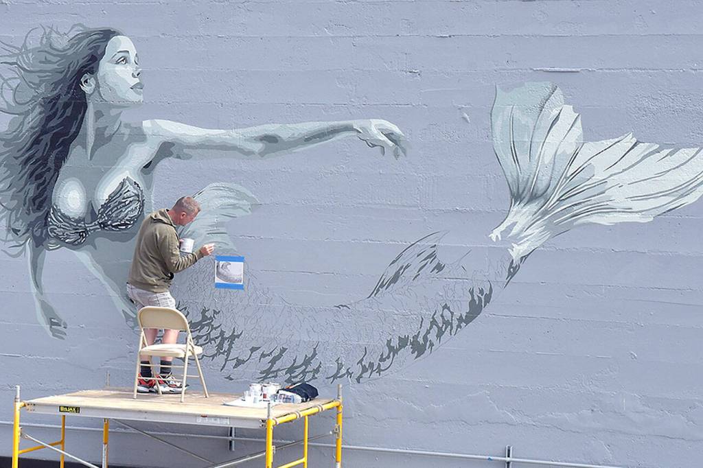 Artist Christopher Keywood of San Diego creates a mermaid mural on the north side of HarborTowne Mall in downtown Port Angeles on Thursday. Keywood, along with the mall’s owner, decided that the blank wall deserved a decoration visible from The Gateway transit center and nearby North Lincoln Street.