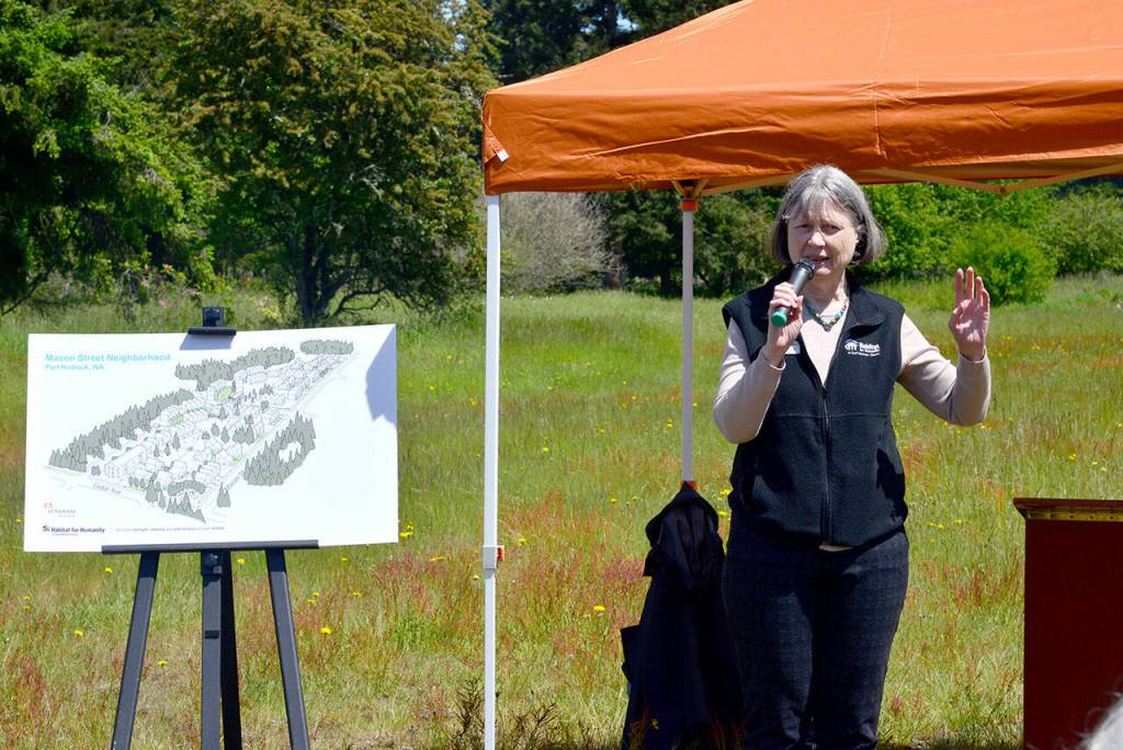Habitat for Humanity of East Jefferson County Executive Director Jamie Maciejewski speaks to a crowd of more than 50 people at the future site of Habitat's affordable housing development in Port Hadlock on Thursday. Habitat hopes to build at least 150 permanently affordable homes at the site, known as the Mason Street project, and on Thursday community members were invited to Port Hadlock to celebrate the next phase of the development. (Peter Segall / Peninsula Daily News)