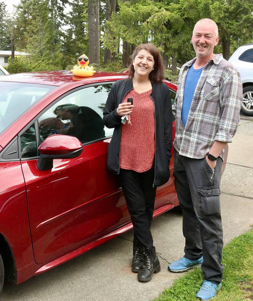 John and Sarah Aten of Port Angeles won the 2024 Toyota Corolla donated by Wilder Auto in the 35th Great Olympic Peninsula Duck Pluck. Sarah said she will mostly drive it. The family buys a package for $350 every year, including one entry in the VID race and 60 entries in the main race. Their VID duck is labeled JETS, which stands for the four members of their family — John, teenagers Elora and Tim as well as Sarah.