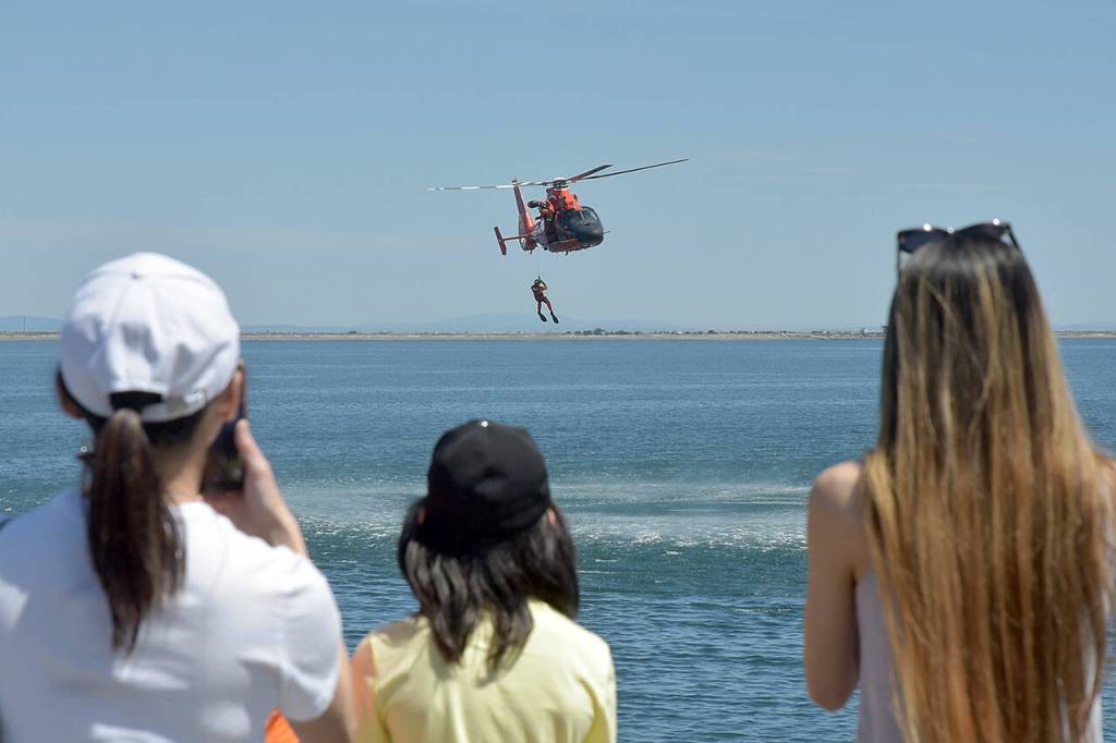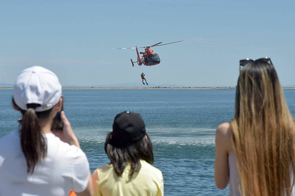 Spectators watch a U.S. Coast Guard rescue drill in Port Angeles Harbor during Saturday’s Maritime Festival along the Port Angeles waterfront. The two-day event, hosted by the Port of Port Angeles, served as a showcase for boating and the maritime trades.