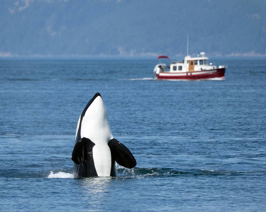 An orca spy hops for a better look at its surroundings during an encounter on Wednesday in the Strait of Juan de Fuca near Sequim.