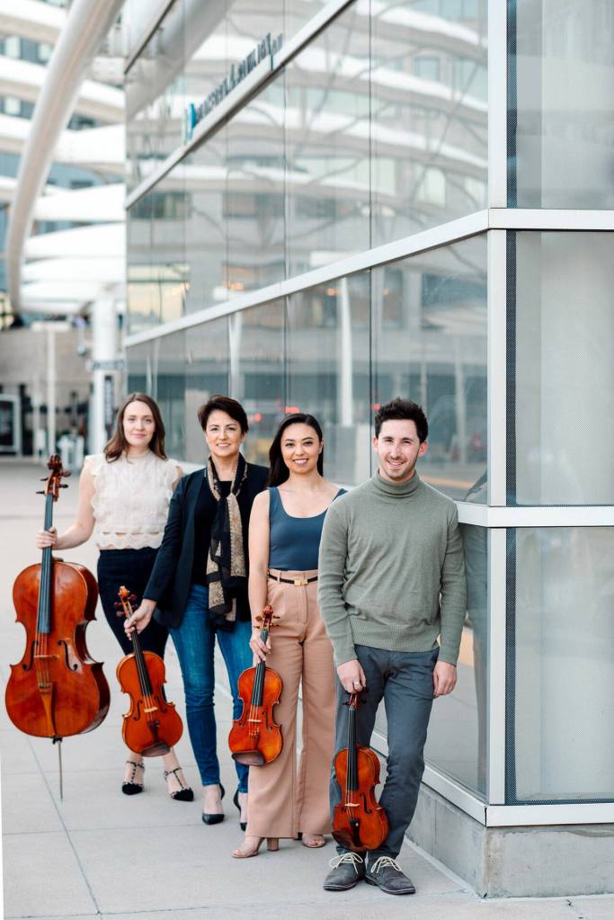 The quartet is composed of Sam Weiser, violin; Marisa Ishikawa, violin; Korine Fujiwara, viola; and Ariana Nelson, cello.