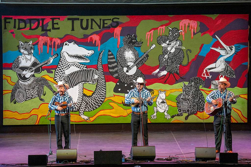 A trio, Canto a Mi Tierra of Veracruz, Mexico, with Osiris Ramses Caballero Leon, left, Bernabe Hernandez Orozco, center, and Fernando Hernandez Orozco, play a set of traditional Mexican music originating in the six states of northeastern Mexico in McCurdy Pavilion on Saturday in one of the final concerts to close out the week of Fiddle Tunes presented by Centrum at Fort Worden.