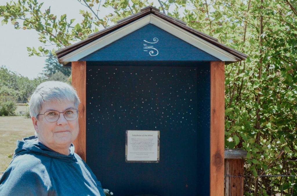 Diane Fatzinger stands near her wind phone located across from the Sequim School District soccer fields on the Olympic Discovery Trail. (Elijah Sussman/Olympic Peninsula News Group)