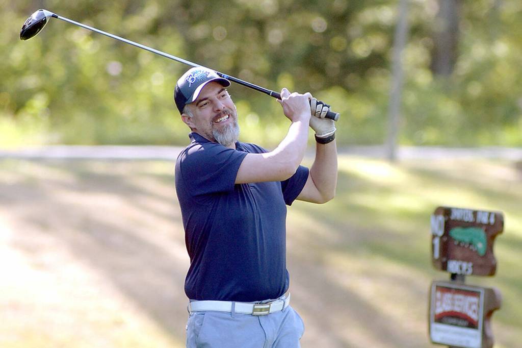 KEITH THORPE/PENINSULA DAILY NEWS Tommy Post, part of a group basing at Sunland, tees off on the first hole of Peninsula Golf Club during Friday’s session of the Clallam County Amateur Championship tournament.