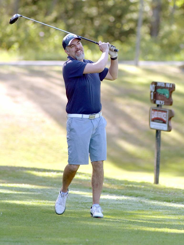 Tommy Post, part of a group basing at Sunland, tees off on the first hole of Peninsula Golf Club during Friday's session of the Clallam County Amateur Championship tournament.