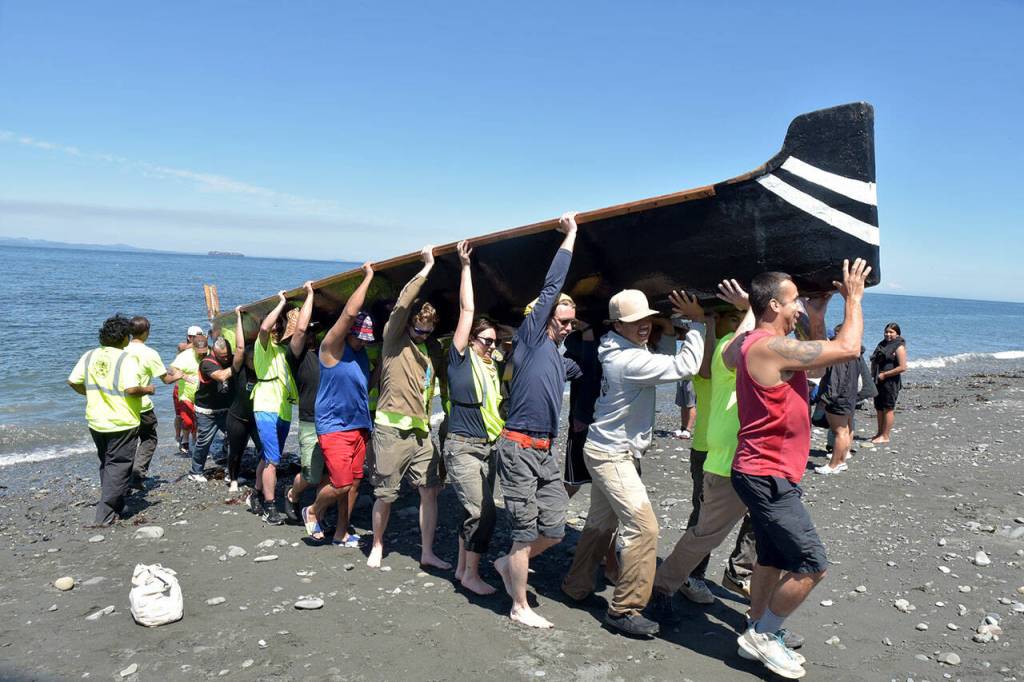 A canoe from Ahousaht First Nations of western Vancouver Island is hauled ashore by volunteers Tuesday on Lower Elwha Klallam land near the mouth of the Elwha River west of Port Angeles, a port of call and point of welcome for haulers taking part in Power Paddle to Puyallup Youth Canoe Journey 2024. Tribal groups from across southern Canada and the Pacific Northwest are taking part in the journey, which culminates with dozens of tribes gathering on Puyallup territory in Tacoma on Aug. 1.