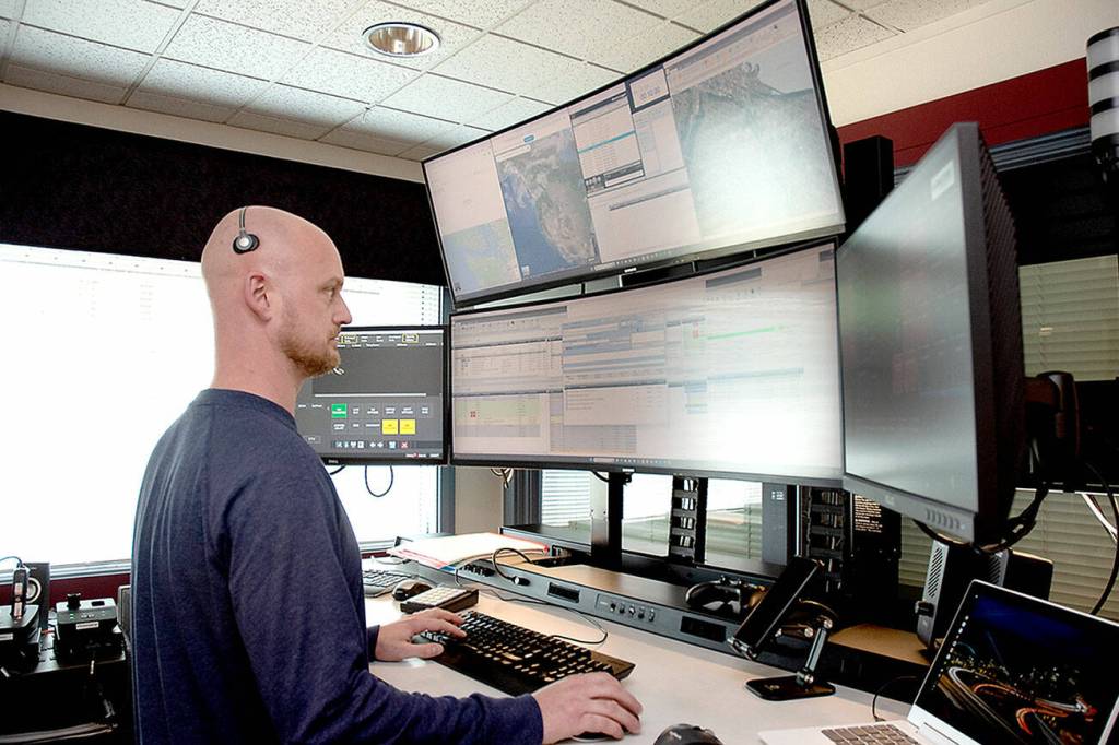 Communications officer Ian Harrington oversees a bank of computer screens at the Peninsula Communications emergency dispatch center on Wednesday in Port Angeles.