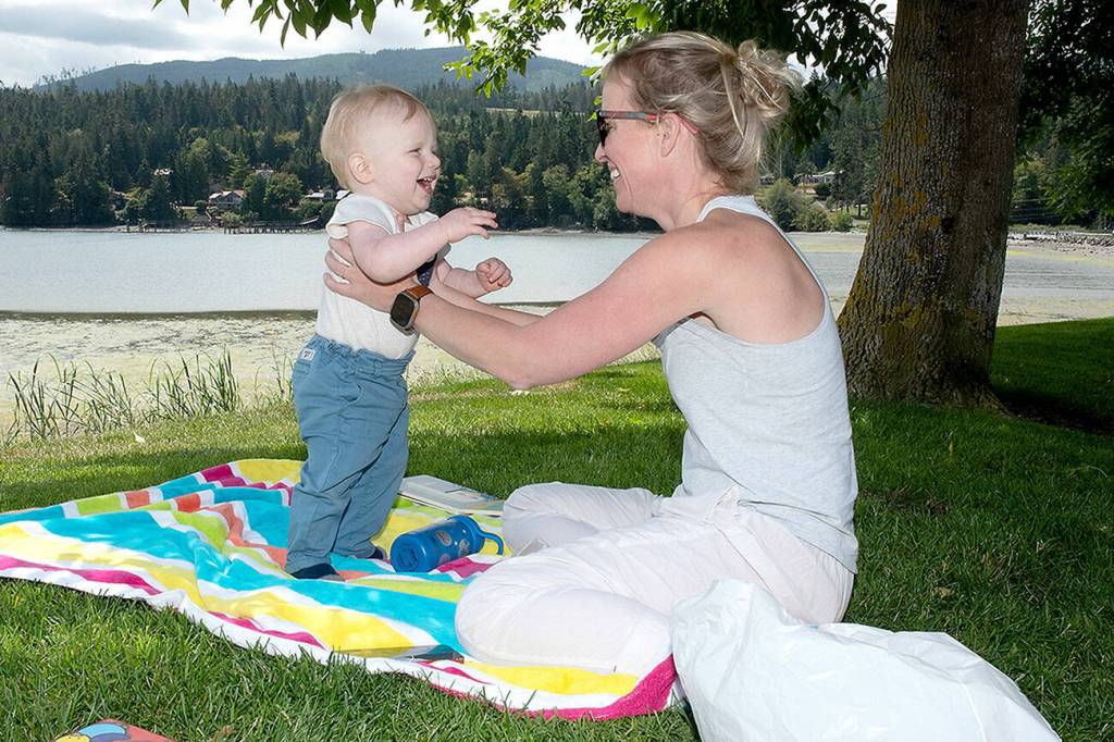 Jamie Nautsch of Sequim plays with her son Christian Nautsch, 1, on the lawn overlooking Sequim Bay at John Wayne Marina on Thursday. Summer-like weather made for a pleasant day next to the water.