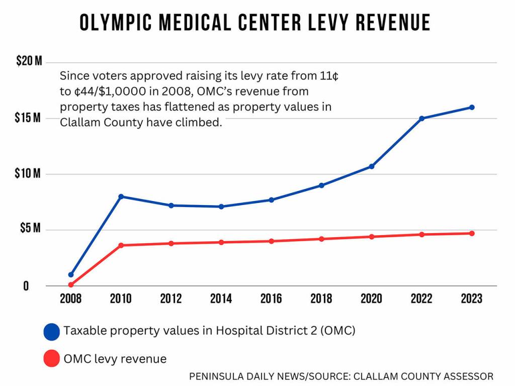 Rising property values in Clallam County have pushed OMC’s levy rate down from 44 cents per $1,000 assessed property value in 2008 to 37 cents today. Its levy rate will continue to fall if property values continue to climb, flattening the amount of tax levy revenue it collects.