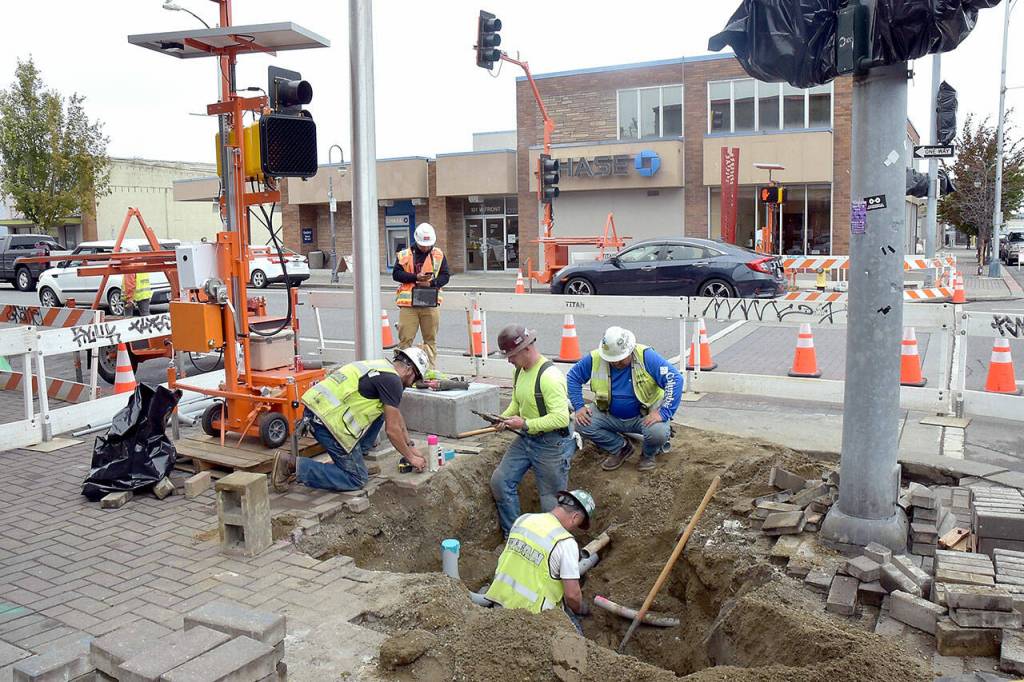 A crew from Pacific-based Titan Earthwork LLC rewires the traffic lights at Front and Laurel streets in downtown Port Angeles on Tuesday as part of a larger safety project to improve 13 intersections across the city.