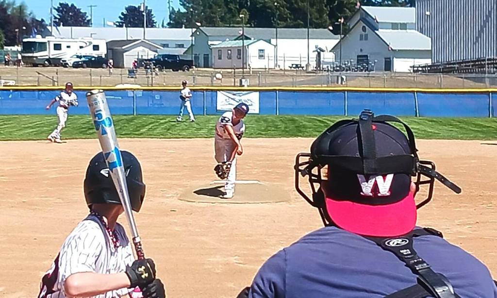 The Port Angeles Youth Baseball team’s Julian Wells throws a pitch during the 25th annual Dick Brown tournament at the Lincoln Park ballfields Saturday. A total of 12 teams attended the tournament for 18 games over two days. (Pierre LaBossiere/Peninsula Daily News)