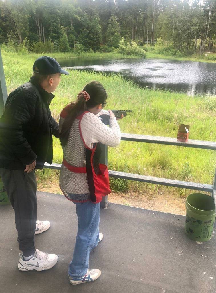 They’re amazed, she said, particularly when they watch the video of what she calls “antics”: making coleslaw (shooting cabbage and onions in the air), putting holes in dimes with his shots, and hitting targets while riding a unicycle.