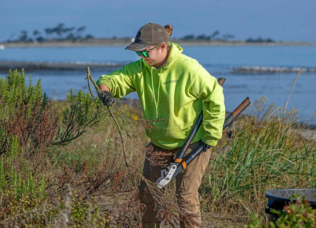 Port of Port Townsend employee Eva Ellis trims brush and weeds out of the rain gardens Wednesday morning at Point Hudson in advance of the annual Port Townsend Wooden Boat Festival Sept. 6-8 at Point Hudson Marina.