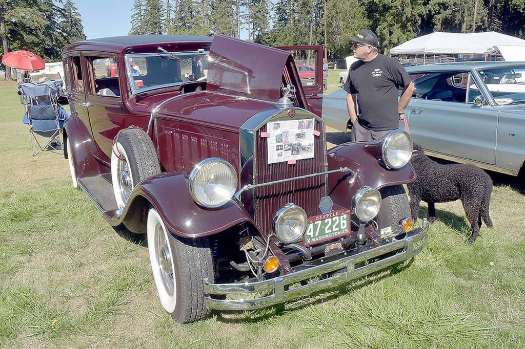 John Anderson of San Juan Capistrano, Calif., and his dog, Myla, examine a 1929 Pierce Arrow Model 133 on display at the Kiwanis Club of Port Angeles Car Show on Saturday at the Clallam County Fairgrounds. Dozens of classic and vintage automobiles were on display in an event to benefit Kiwanis community programs.