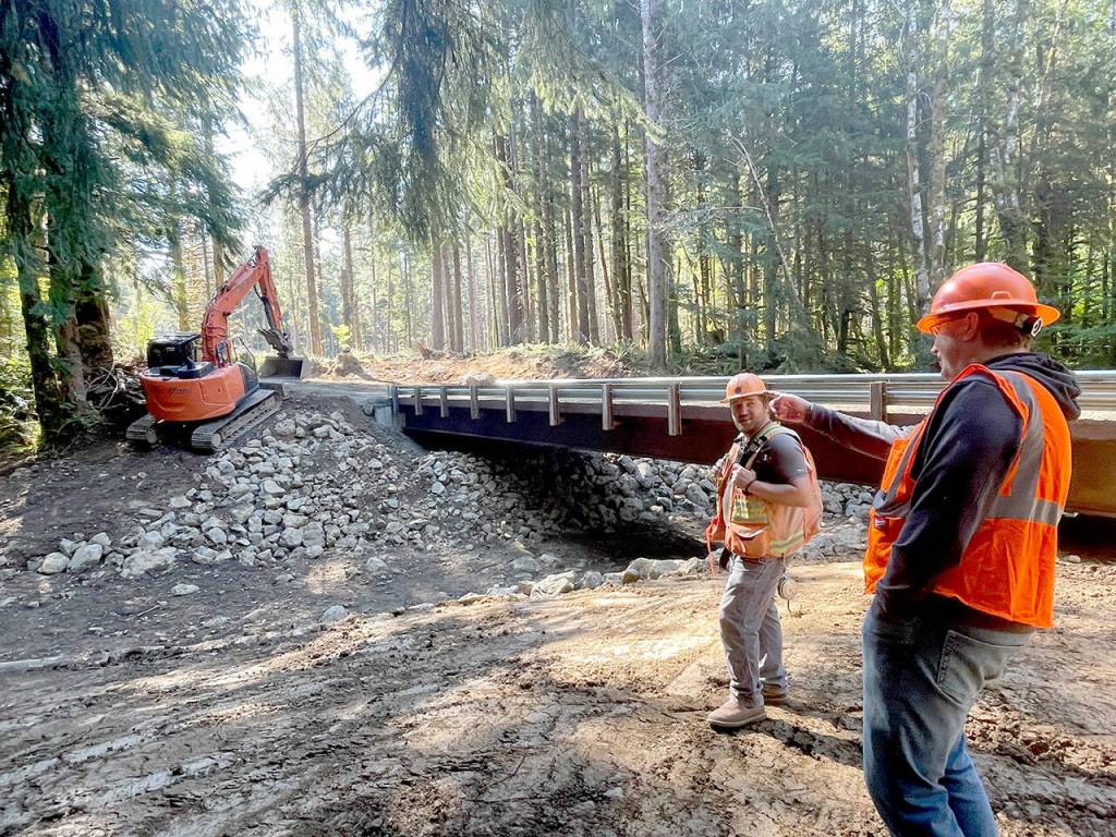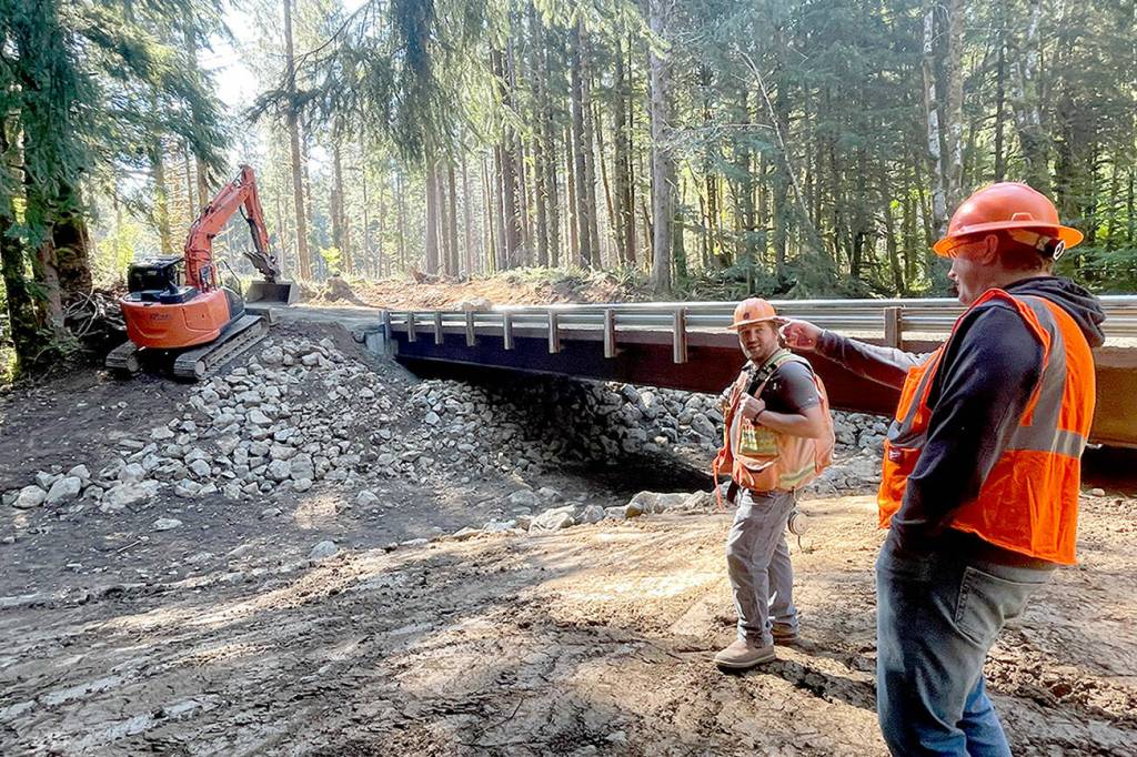 OLYMPIC NATIONAL FOREST — About five miles south of milepost 212 on U.S. Highway 101, the finishing touches are being put on a 70-foot steel bridge that spans a dry, unnamed tributary to the North Fork Calawah River in the Olympic National Forest.