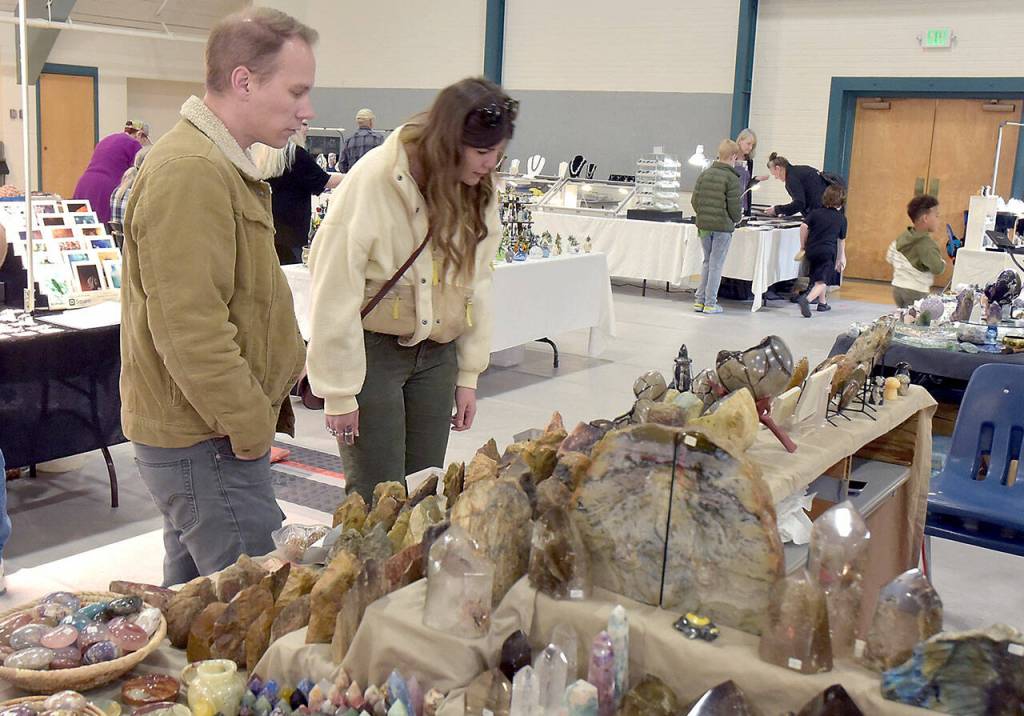 Jason Eason, left, and Amanda Krott, both of Bremerton, examine a collection of rocks and minerals on display by Rockin’ the Castle of Lebanon, Ore., during Saturday’s Gem, Rock and Jewelry Show at Vern Burton Community Center in Port Angeles.