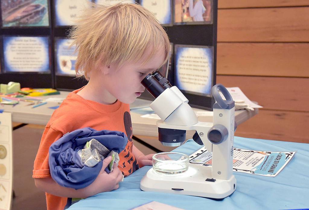 Helen Haller Elementary third-graders Annyah Beck, 9, left, and Accasia Andertson, 8, examine a water quality display using an oyster for demonstration at a booth staffed by Rob Banes and Liz Maier, both health advisers for the state Department of Health, during the Dungeness River Festival on Friday at the Dungeness River Nature Center in Sequim.