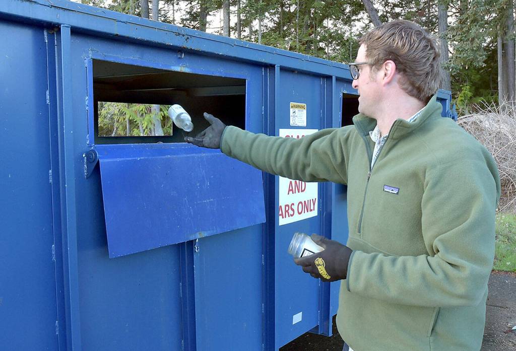 Beeler Van Orman of Port Angeles tosses a glass bottle into a recycling bin on Thursday at the Regional Transfer Station in Port Angeles. (Keith Thorpe/Peninsula Daily News)