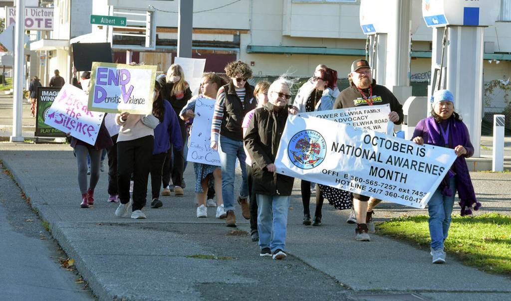 Participants in the a walk to raise awareness of domestic violence make their way down First Street on a journey from the Elwha Heritage Center to Healthy Families of Clallam County in Port Angeles on Wednesday. The event also included resource booths, shared stories and food and beverages, hosted by the Lower Elwha Klallam Tribe.