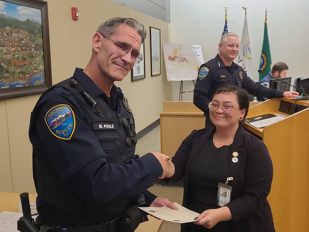 Sequim Deputy Mayor Rachel Anderson read a proclamation and, along with Police Chief Mike Hill, honored Poole with the award and a plaque at the Oct. 14 city council meeting.