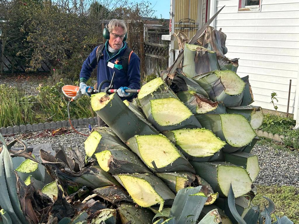 In recent years, she had said it was a bucket-list item to see it grow a stalk and bloom before she passed away. On Nov. 15, she and family members watched from a window as Clallam County Master Gardener volunteers meticulously cut and removed the massive agave.