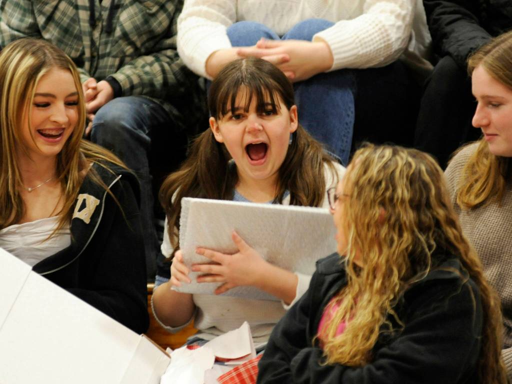 Sequim High School senior Sophia Treece shares her excitement with friends after she receives a new laptop for college at the Winter Wishes assembly on Dec. 18. (Matthew Nash/Olympic Peninsula News Group)