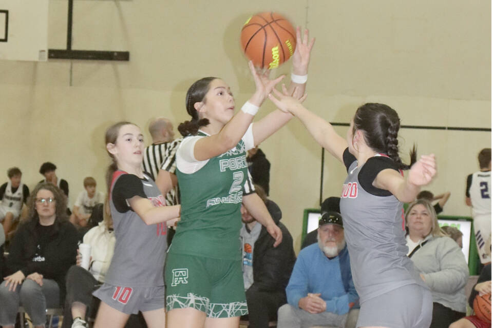 Here, Helen Martin of the Port Angeles seventh-grade girls team, made up of players from Stevens Middle School, Queen of Angels and Neah Bay, goes up against Stanwood.