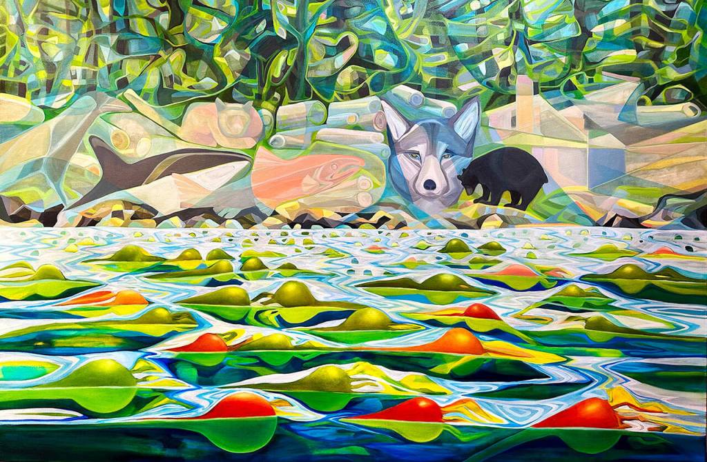 One of the largest paintings is titled “Marriage Proposal.” It depicts animals seen during Franklin and her husband Leon Somme’s circumnavigation of Vancouver Island, the kayak trip during which Somme asked Franklin to marry him.