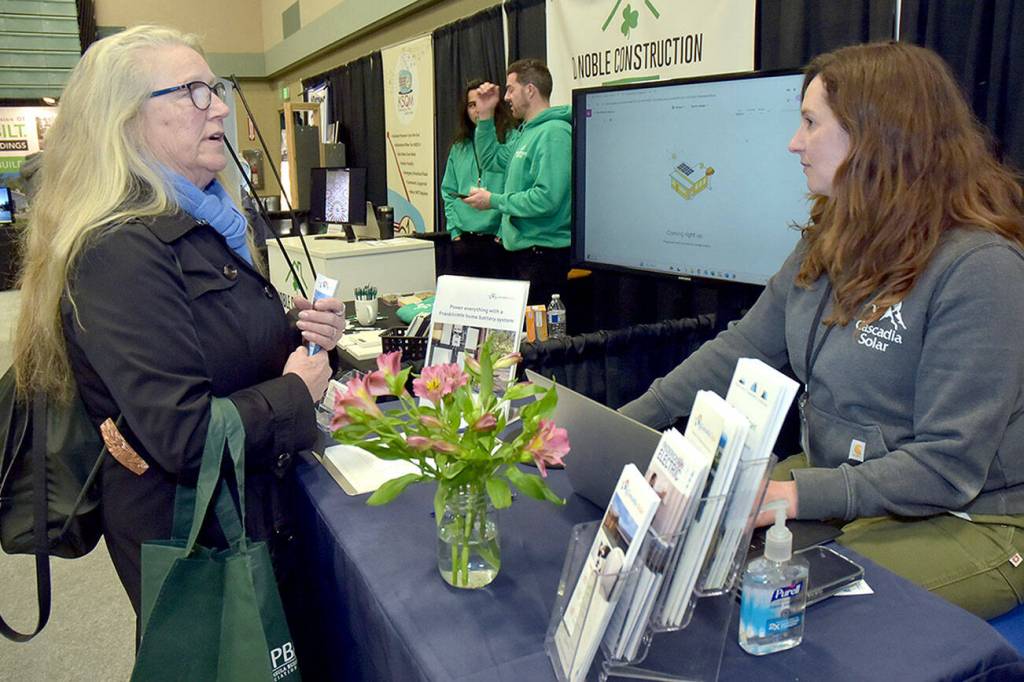 Cheryl Gertsch of Sequim, left, talks with Krista Meyers, project manager with Cascadia Solar of Port Townsend during the annual Home Building, Remodeling and Energy Expo on Saturday at Sequim Middle School.